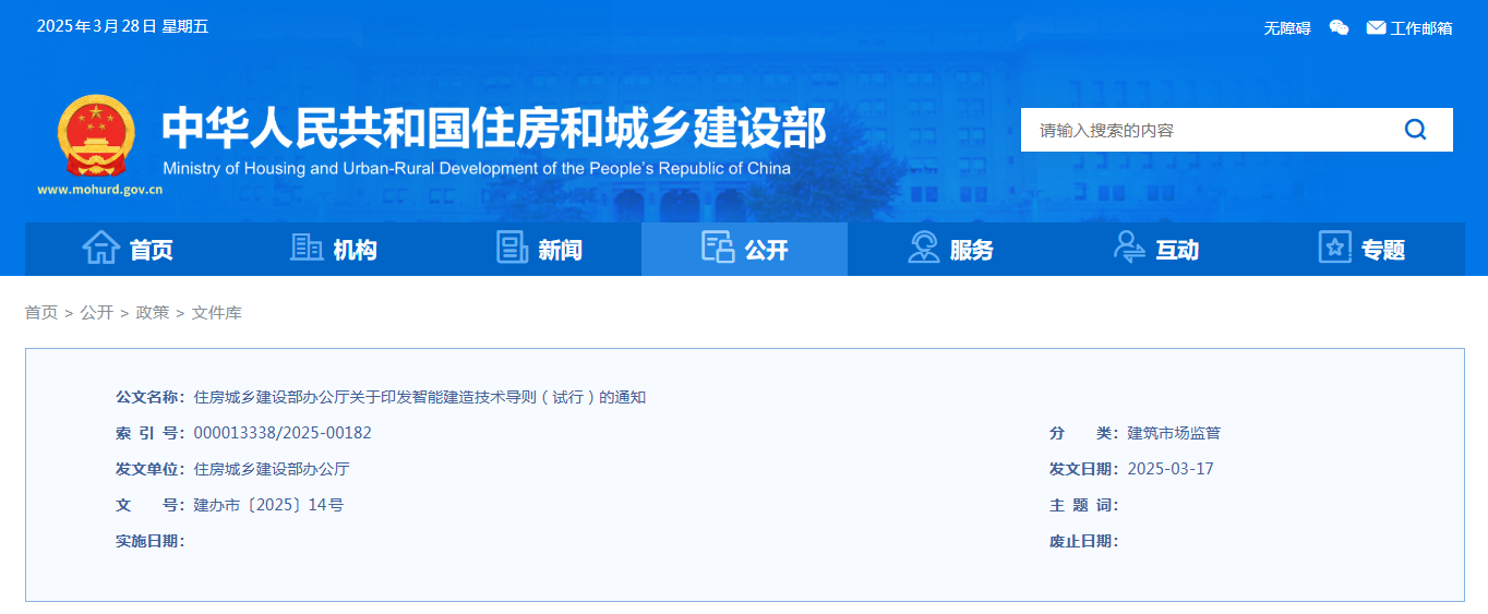 為貫徹落實《中共中央辦公廳、國務院辦公廳關于推進新型城市基礎設施建設打造韌性城市的意見》等文件要求,加快推進智能建造技術在工程建設全生命期應用,推動建筑業(yè)高質量發(fā)展,住房城鄉(xiāng)建設部組織編制了《智能建造技術導則(試行)》?,F(xiàn)印發(fā)給你們,請結合實際參照執(zhí)行。